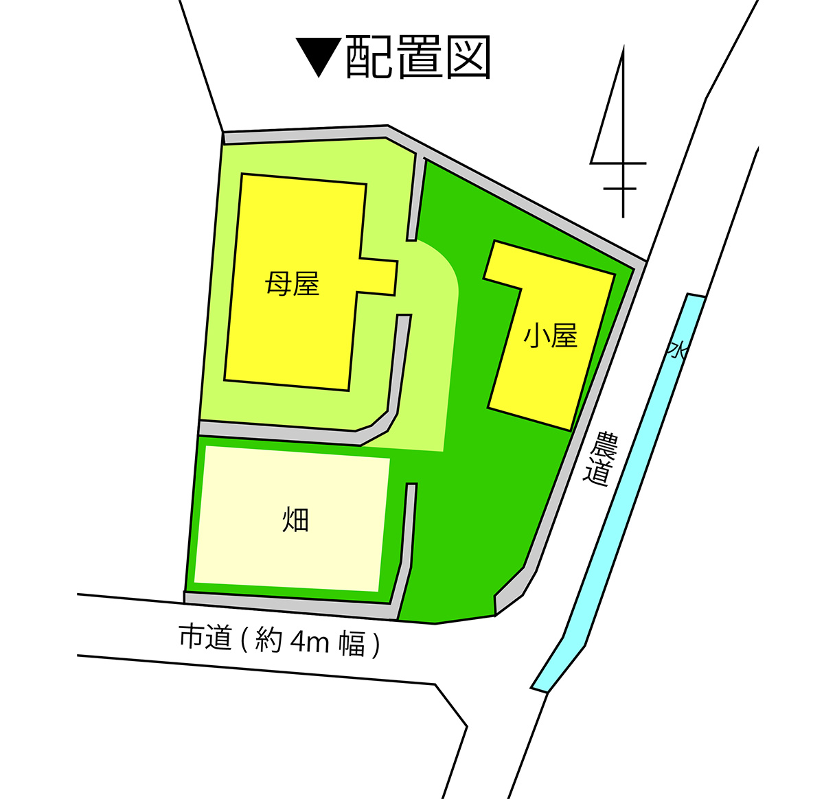 市道と農道の角地で、各方向の接道は20mほどありますが、石垣がある為、敷地の出入口は2m程度です。